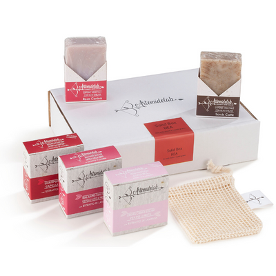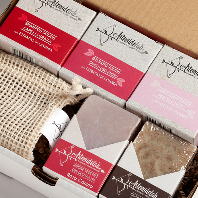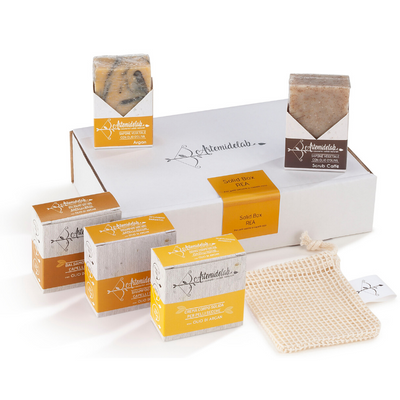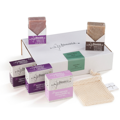 La solid box Rea è il kit ideale per il tuo bagno senza plastica: shampoo, balsamo, crema idratante, scrub e sapone doccia.